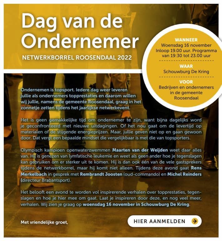 Iedere dag leveren ondernemers topprestaties en daarom heeft de gemeente Roosendaal een netwerkevent georganiseerd met als thema: ondernemen, topprestaties & tegenslagen.